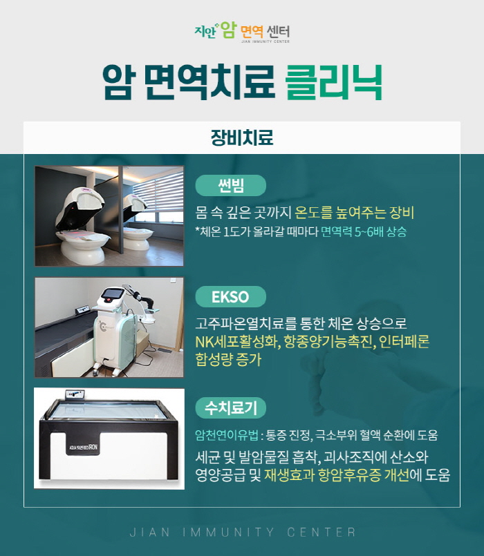 그래서 송도암병원 지안 암면역센터의 경우 여러 장비들을 갖추어두고 있습니다. 환자분의 면역력 강화를 돕기 위해 힘쓰고 있는데요. 체내 깊은 곳까지 온도를 높여서 면역력을 강화시키는데 도움을 주는 썬빔과 항종양기능 촉진에 도움을 주는 EKSO, 고압의 온수를 분사해서 통증을 줄이고 혈액순환 개선을 기대할 수 있는 수치료기 등이 있습니다.
