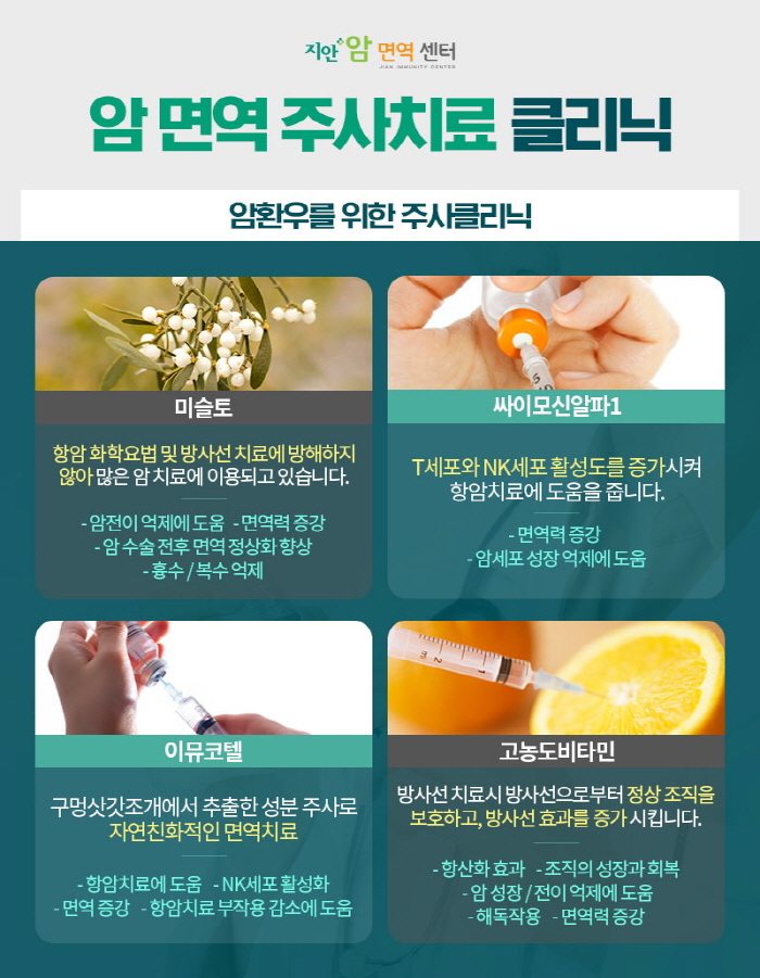 또 말기까지 진행되신 분들의 경우 면역력이 굉장히 낮은 수준까지 떨어져 있을 확률이 높은데요. 그래서 지안 암면역센터에서는 앞서 말한 장비를 활용한 방법 외에도 여러 면역자수가 있답니다.